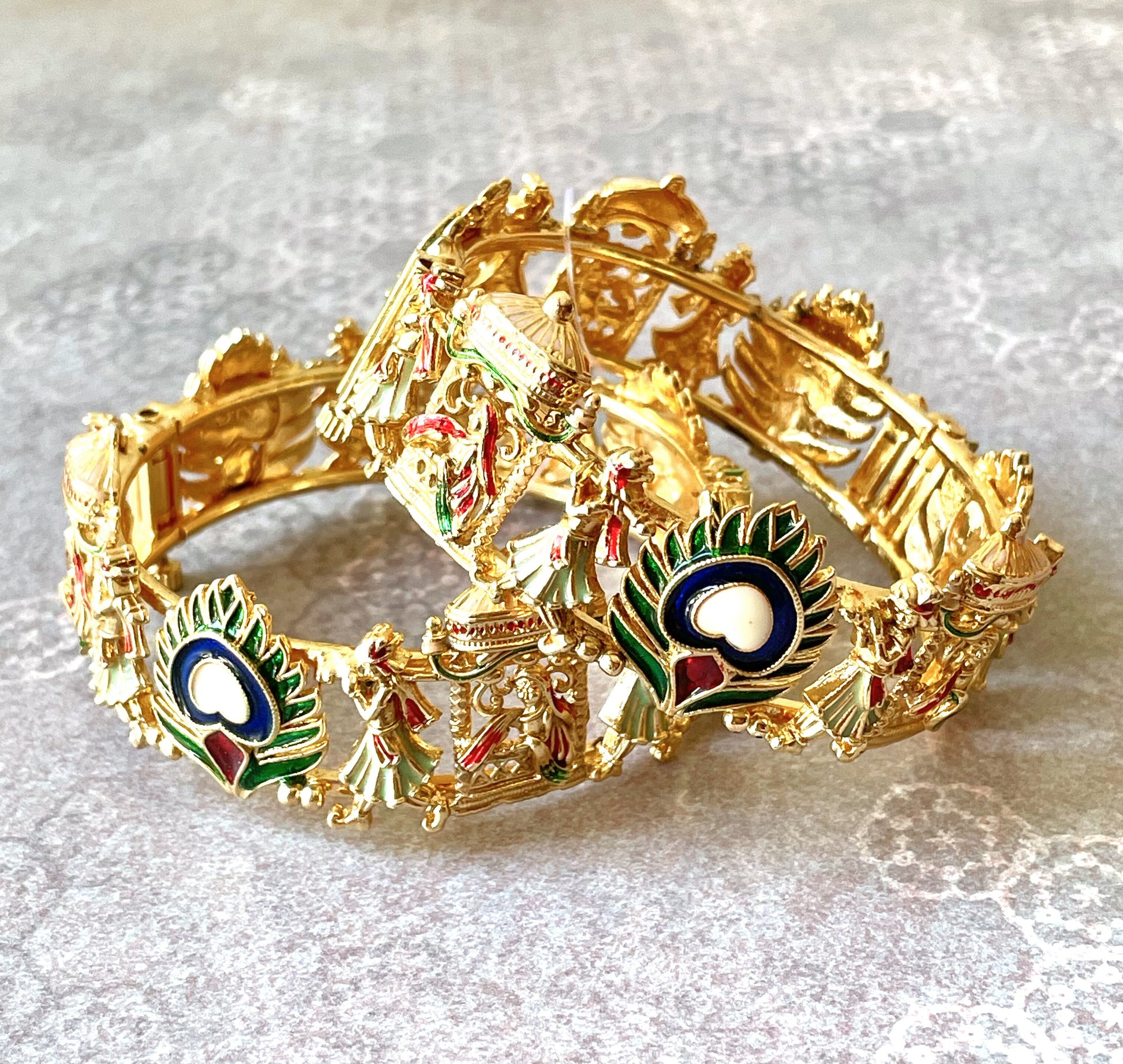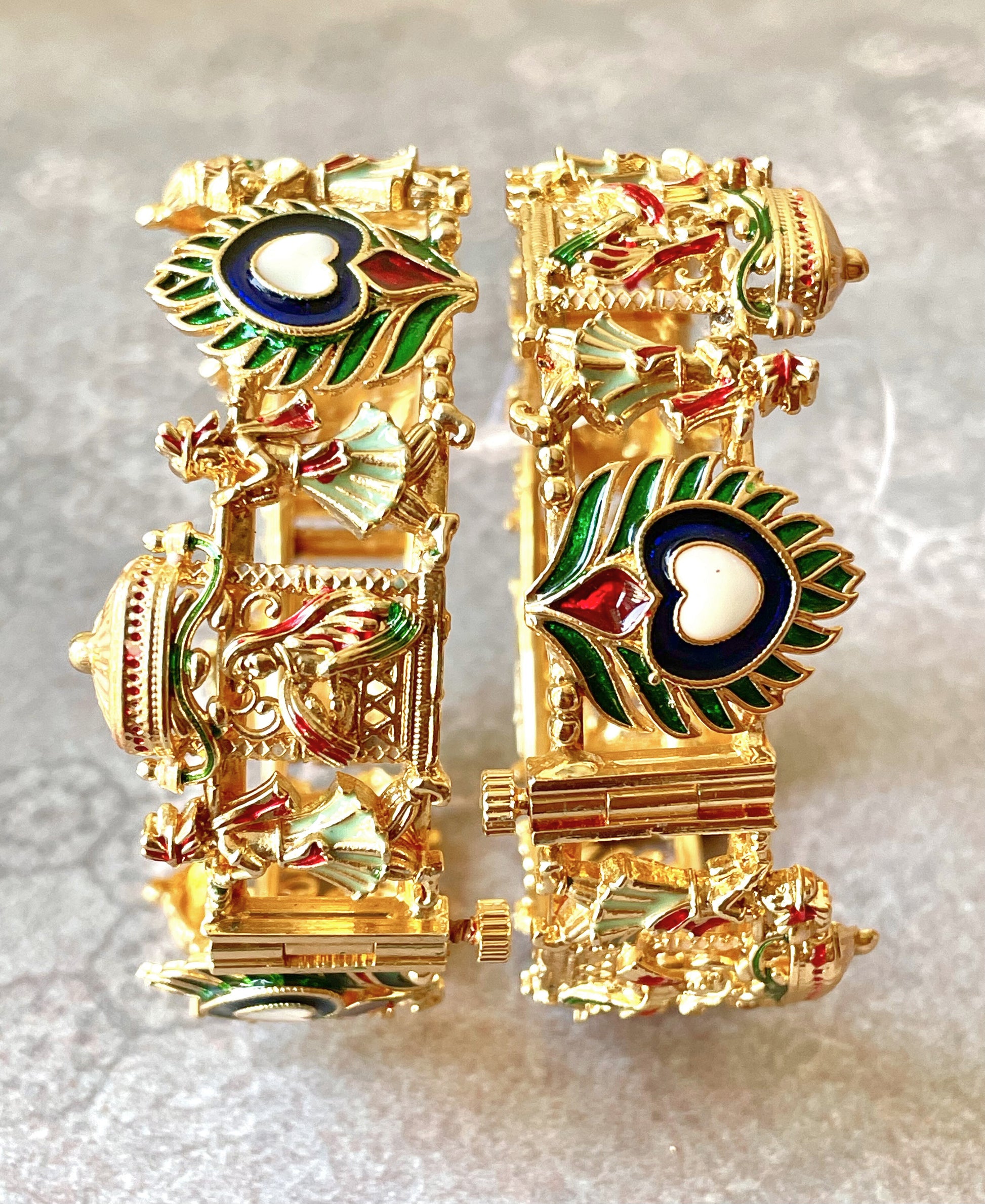 Celebrate timeless elegance with this exquisite bridal piece featuring ornate palanquin motifs rendered in delicate open-work craftsmanship. Bold peacock feather accents dance across the design, while vibrant multi-colored enamel work brings each detail to life. A stunning fusion of traditional artistry and intricate embellishment, perfect for making a regal statement on your special day.