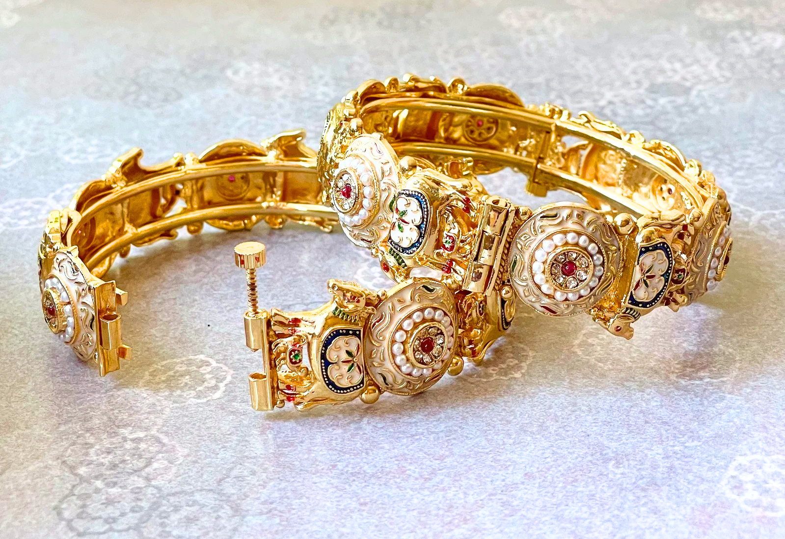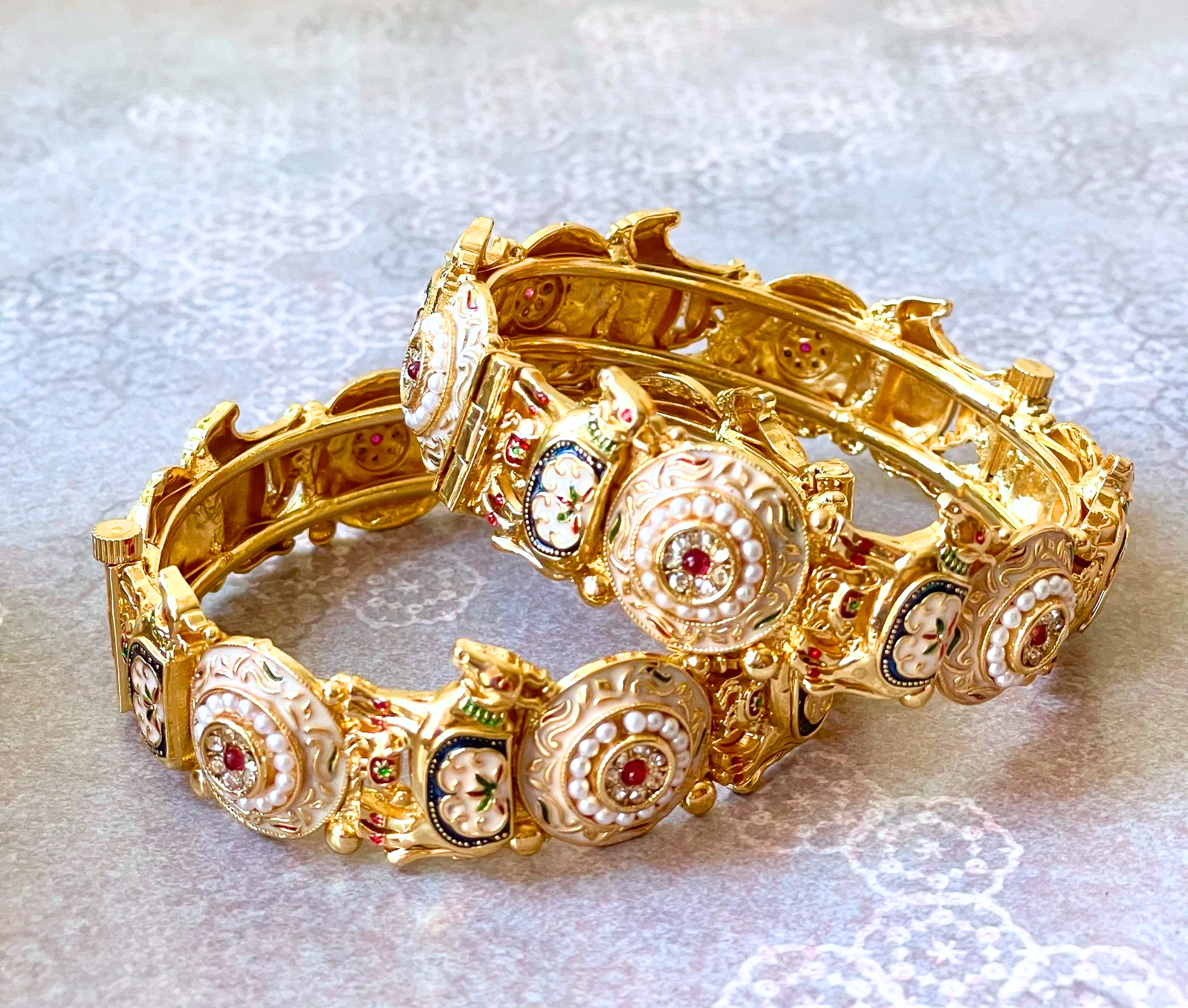 Elevate your jewelry collection with these stunning Ruby Kundan bangles. Each piece showcases vibrant red ruby motifs beautifully complemented by intricate Kundan work and delicate pearl bead clusters. These elegant bangles add a touch of timeless sophistication to any ensemble.