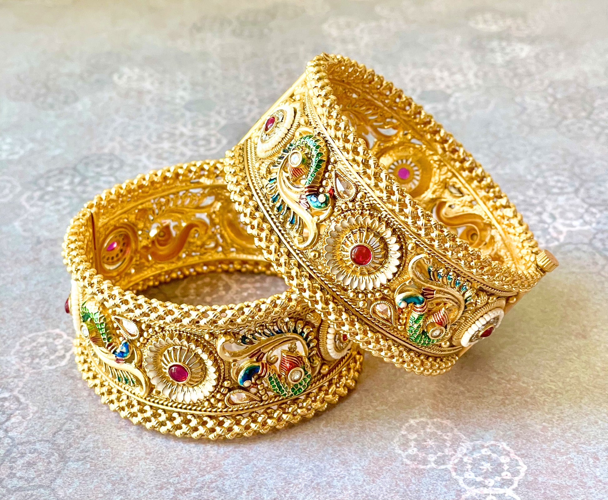 Elevate your ethnic ensemble with these stunning regal cuffs inspired by traditional Rajwada craftsmanship. Featuring intricately detailed peacock motifs adorned with vibrant artistry and rich ruby-colored stones, these wide-band cuffs make a bold statement. Perfect for weddings, festivals, and special occasions, they blend timeless elegance with contemporary flair. Each piece showcases meticulous detailing that captures the majesty of peacock artistry, adding a touch of royal sophistication to your wrist.